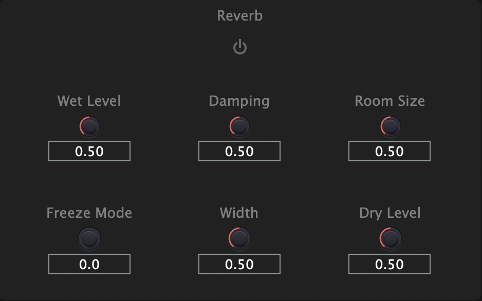 Freeze Mode: 值小於 0.5 為正常的 reverb,值大於 0.5 會將 reverb 聲音輸入至一個持續的迴路中
