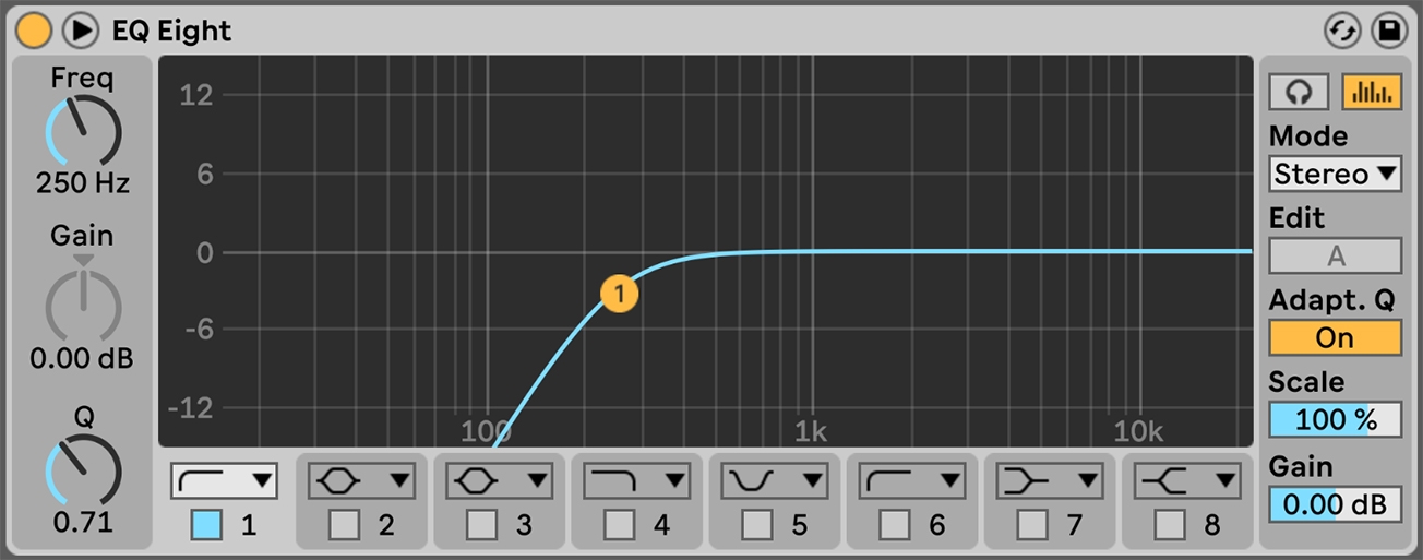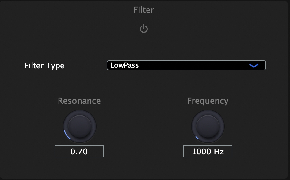 Resonance: 調整 filter 的 Q 值。Q 值如果很低,曲線會變成很寬,就表示就算是離中心頻率很遠的頻率,也會被影響到;Q 值如果很高,曲線會變成很窄,就表示只有很特定範圍的頻率會被影響到