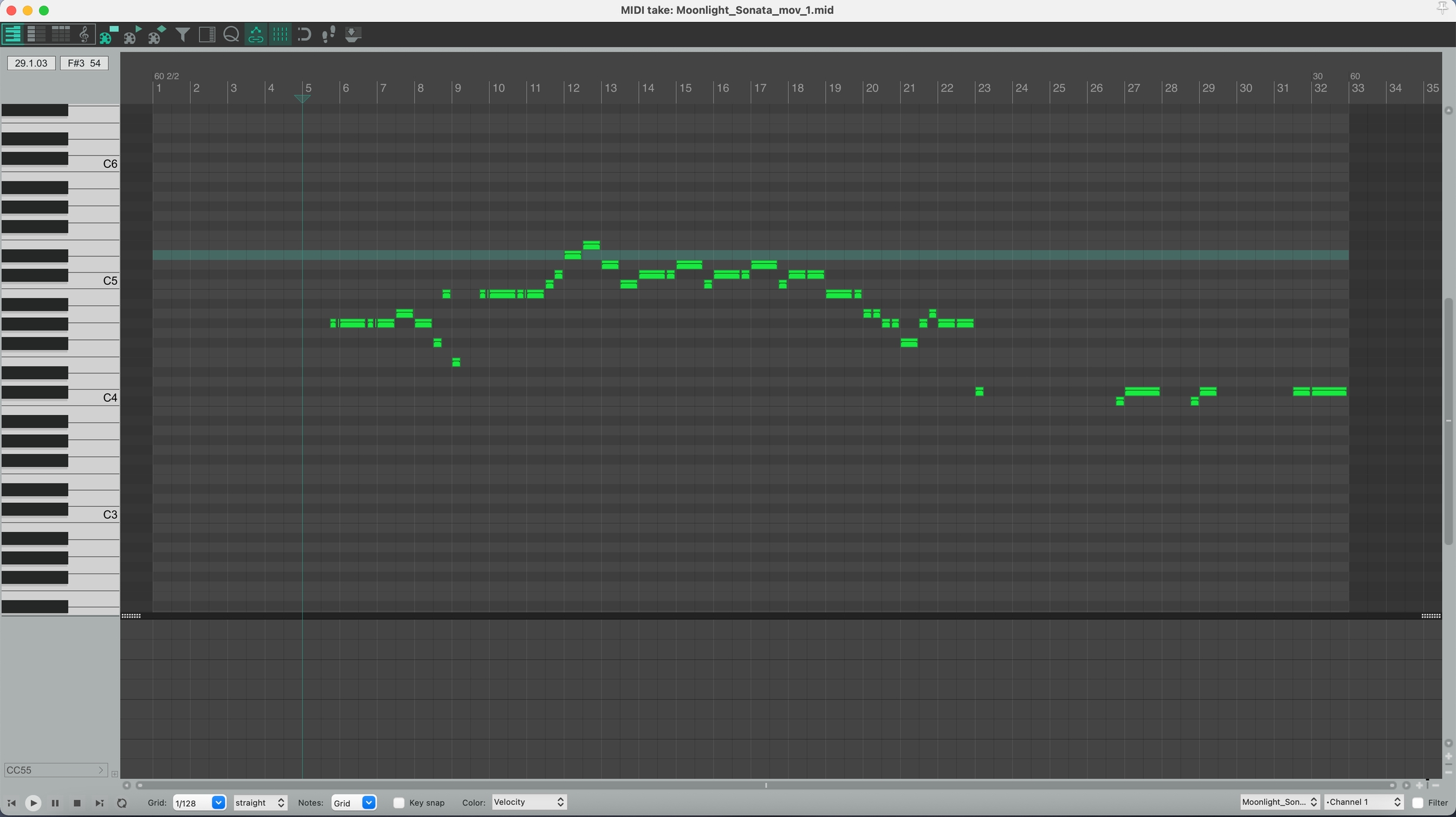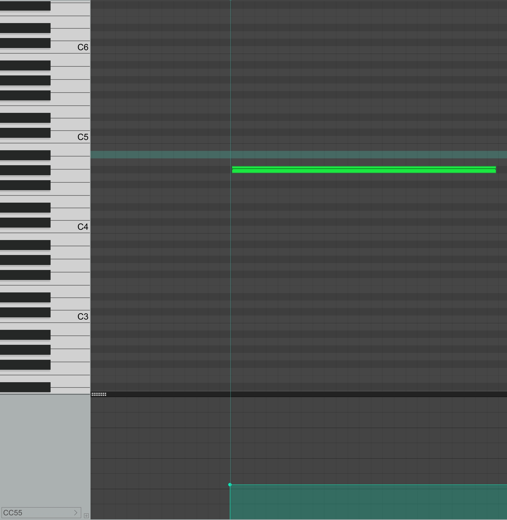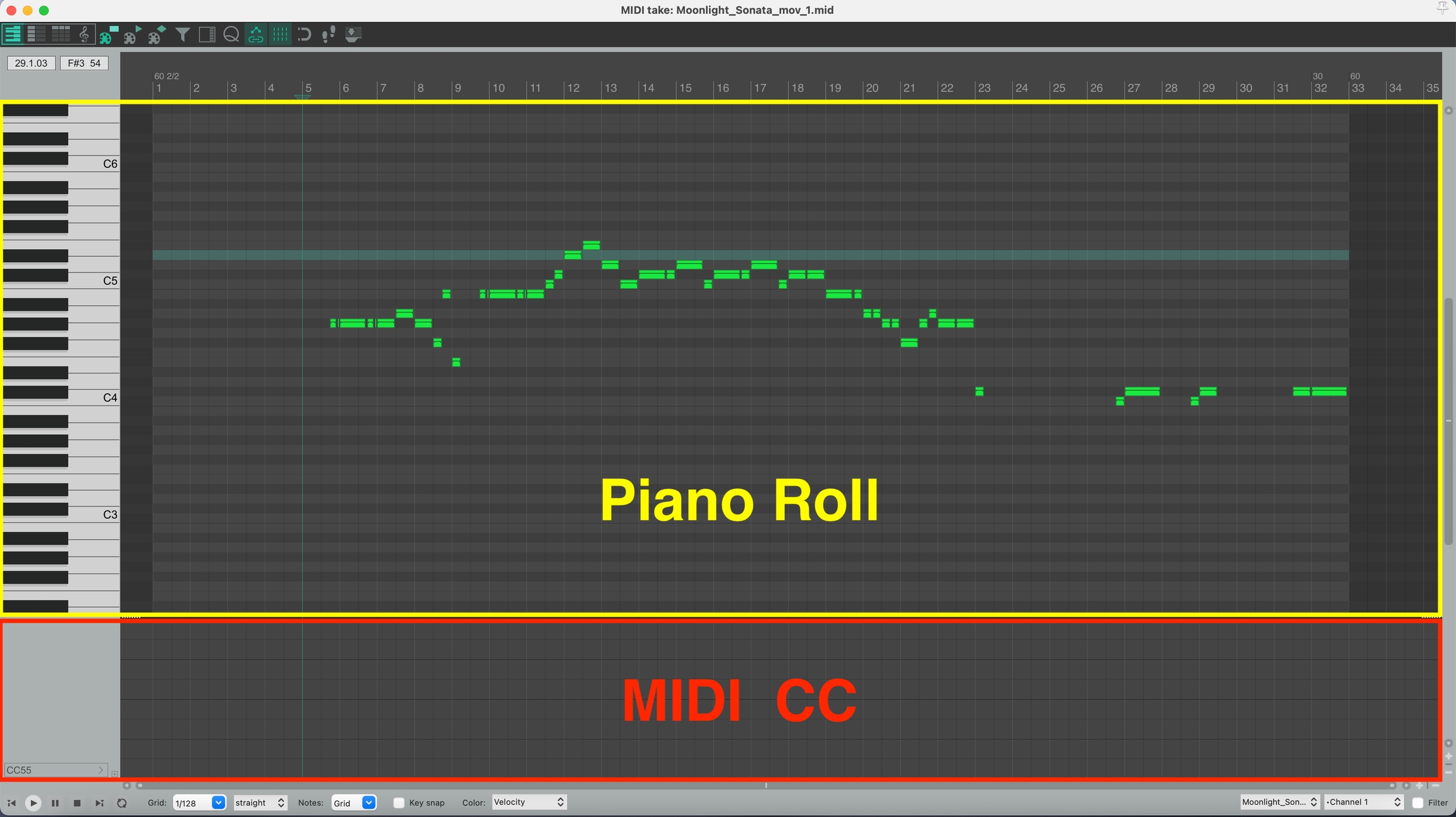 圖 4.7 MIDI 編輯視窗 MIDI 編輯視窗可以簡單分為上下區塊,如 圖 4.8 所示。黃色區塊為 Piano Roll 可以在此增加音符,紅色區塊為 MIDI CC (Control Change) 控制訊號,可以在此加入 midi cc 的值來控制 OrchestraVST