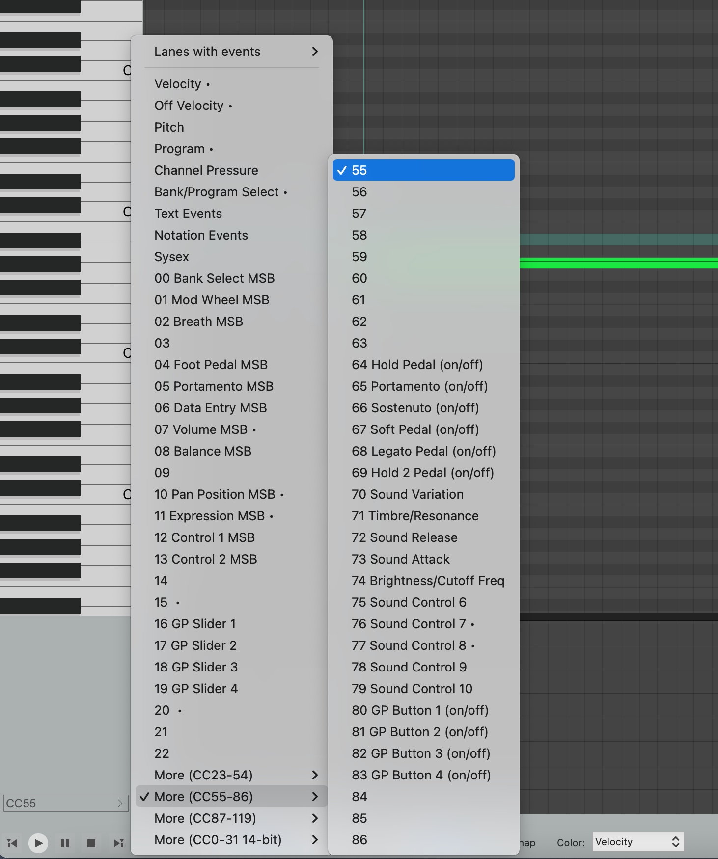 圖 4.9 選擇 MIDI CC 舉例來說,欲利用 MIDI CC 控制一顆音的 Attack ,可以將選單選自 CC 55 並用按著滑鼠拖移賦值,如 圖 4.10 所示,其餘 MIDI CC 對應參數可參考 MIDI 訊號對應