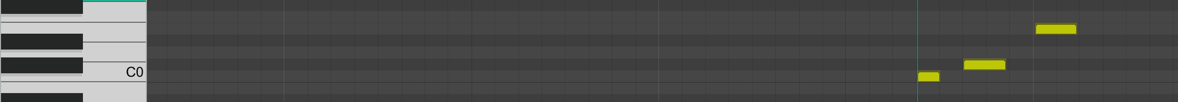 舉例來說,我想讓第一顆音是長音,第二顆是短音,第三科是撥奏,可以在第一顆音底下加入 C0 的音符,第二顆音底下加入 C#0 或 D0 或 D#0 的音符,第三顆音底下加入 E0,如 圖 4.11 所示