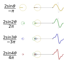 如果說「所有的波形都可以藉由 和 等弦波疊加起來」你相信嗎? 傅立葉級數說明了這一切,下圖為時域與頻域對照圖,第三欄的波形為第二欄所有波形的疊加,第四欄則是第三欄的頻譜。所以在時域看似複雜的波形在頻域卻是單純的頻率分量