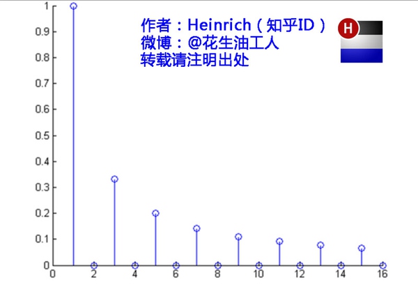 不難發現,在頻譜中,偶數項的振幅都是 0,也就對應了圖中的彩色直線。振幅為 0 的弦波。