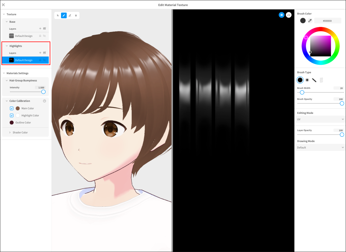 我們可以點擊材質清單 (Material list) 中的「Edit Texture」來開啟該材質的 texture 編輯器。再這裡您可以修改頭髮群組的設計,包含調整髮色與 Base 跟 Highlight texture 之前的平衡,進一步讓角色更立體與真實。