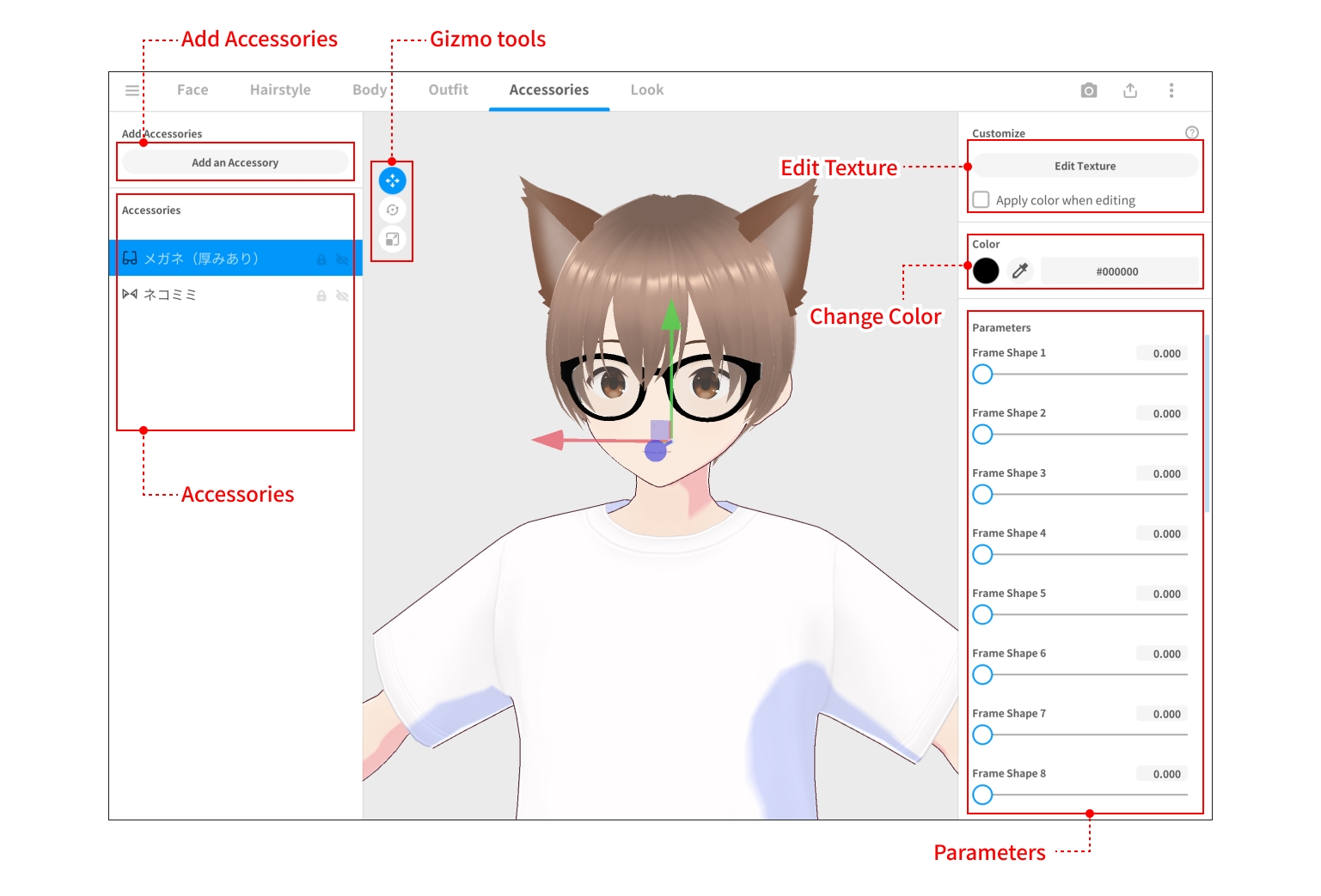 VRoid Studio 1.0 內建一系列可以直接套用在虛擬人物的配件。在這個章節中,我們會介紹配件頁面中設定面板的每個選項。