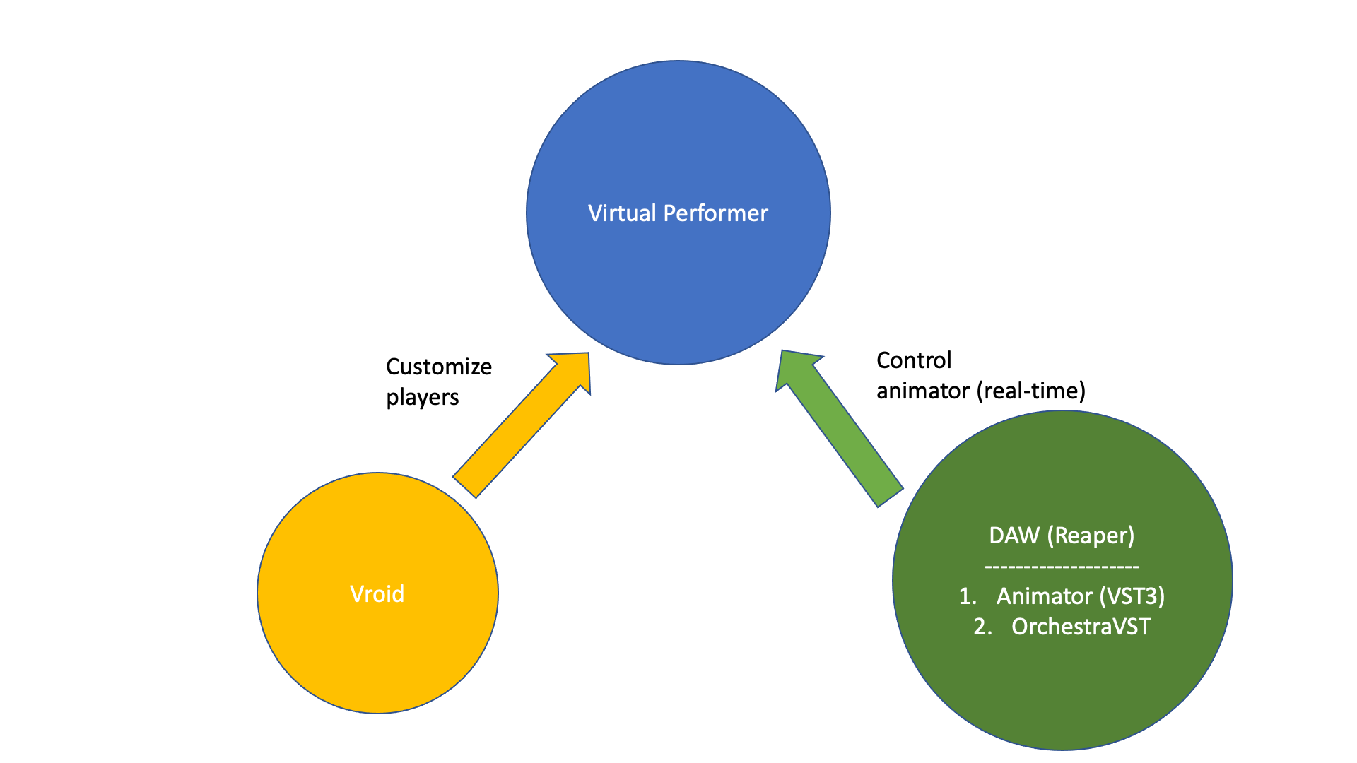 圖 I.2.1 是三個工具之間的互動,Animator 與 OrchestraVST 掛載於數位工作站上,並將控制訊息傳給 Virtual Performer,進一步產生即時的演奏動畫。